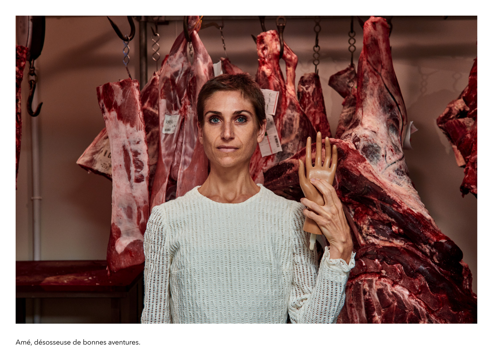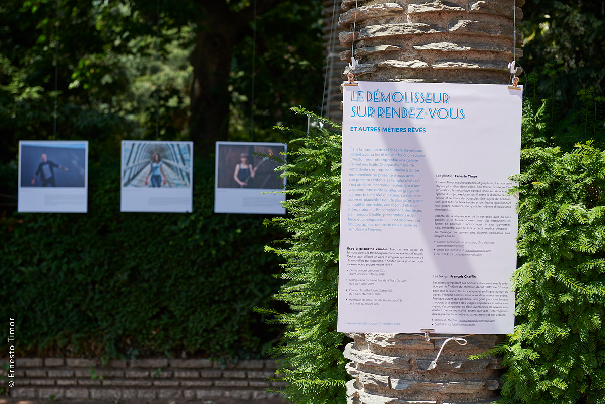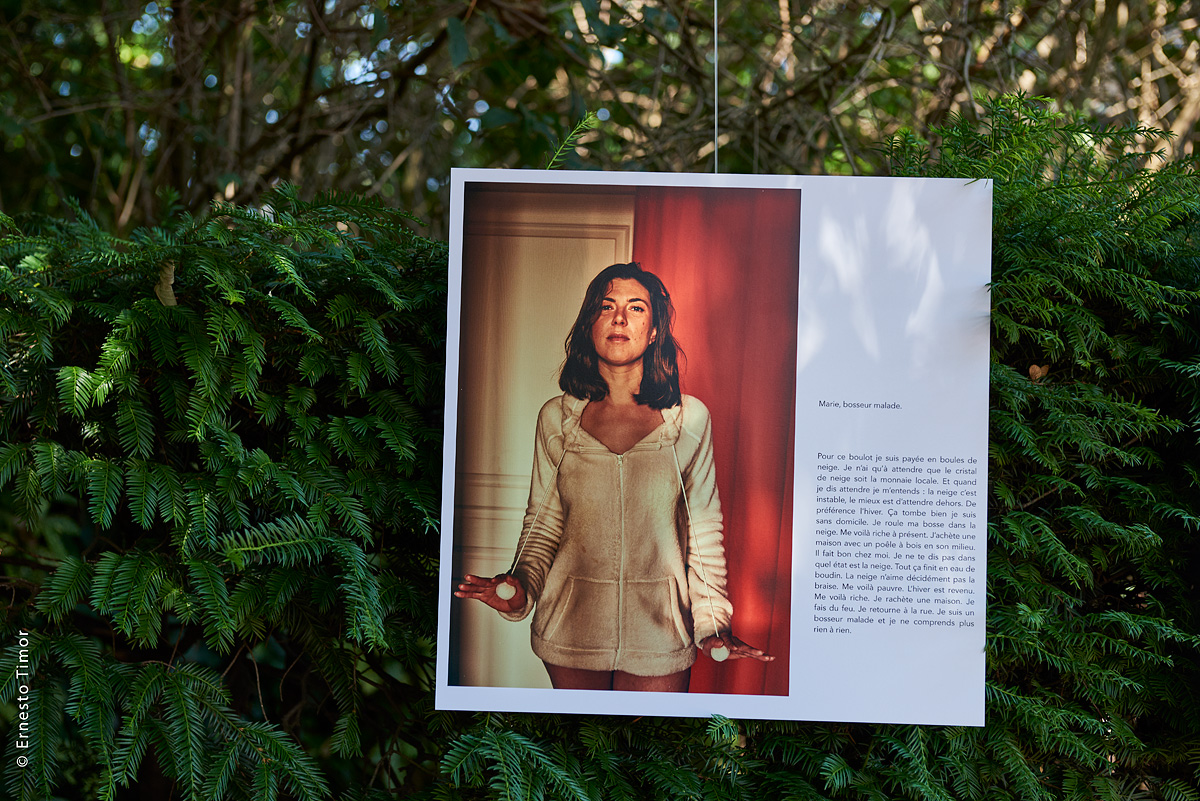 Les textes accompagnant ces portraits sont signés François Chaffin, résonant avec sa création de 51 mots pour dire la sueur, farce poétique et politique autour du travail, spectacle créé début 2019. D’abord dérivées du texte du spectacle, ces présentations fictives se sont nourries par la suite de ce que lui inspiraient les diverses personnalités photographiées, une sorte de gueule de l’emploi à l’envers, en somme…