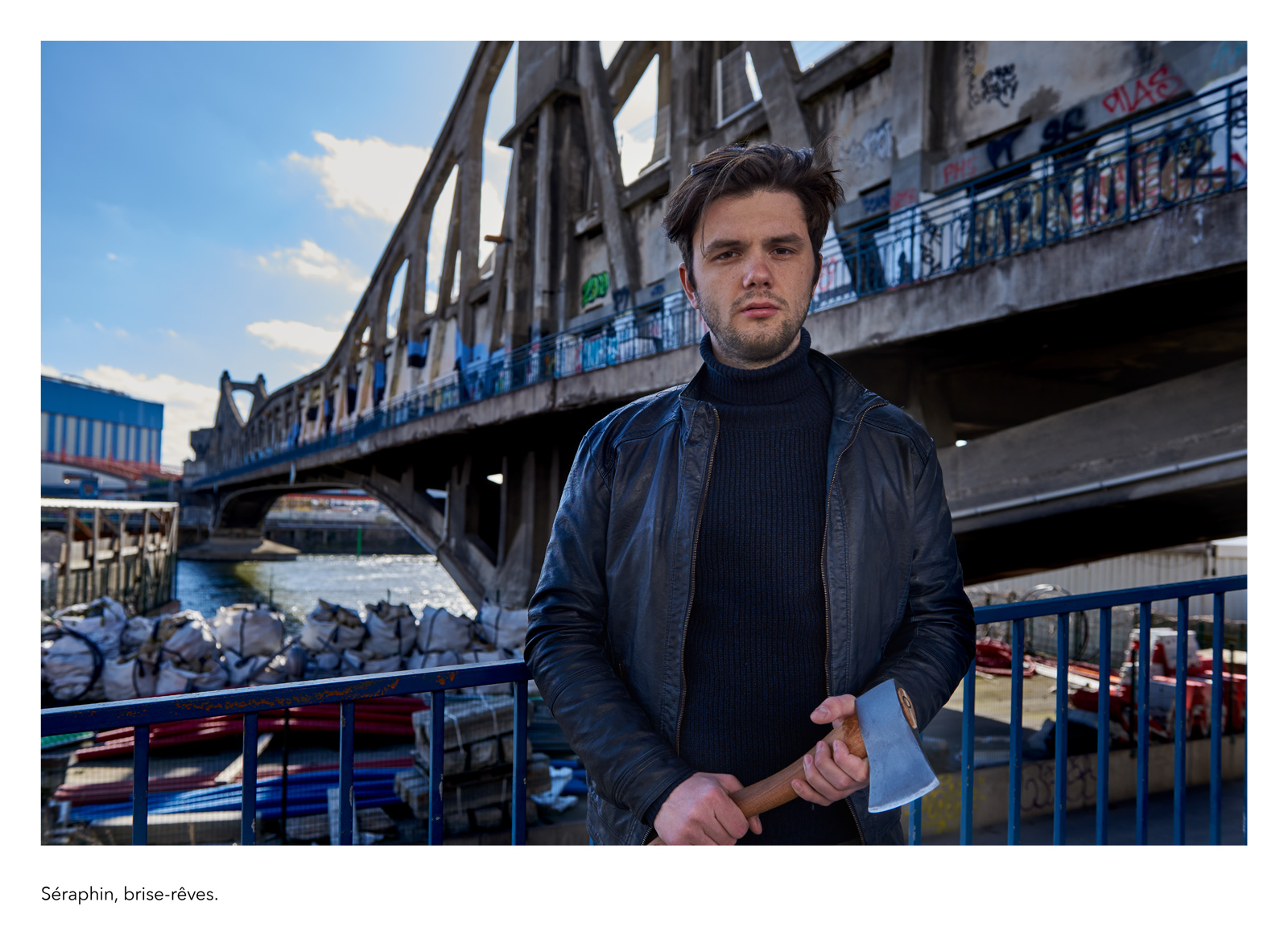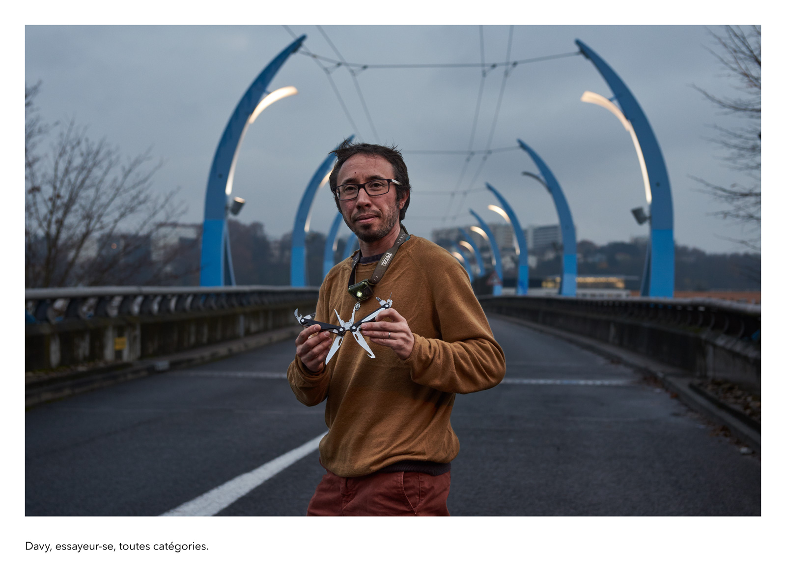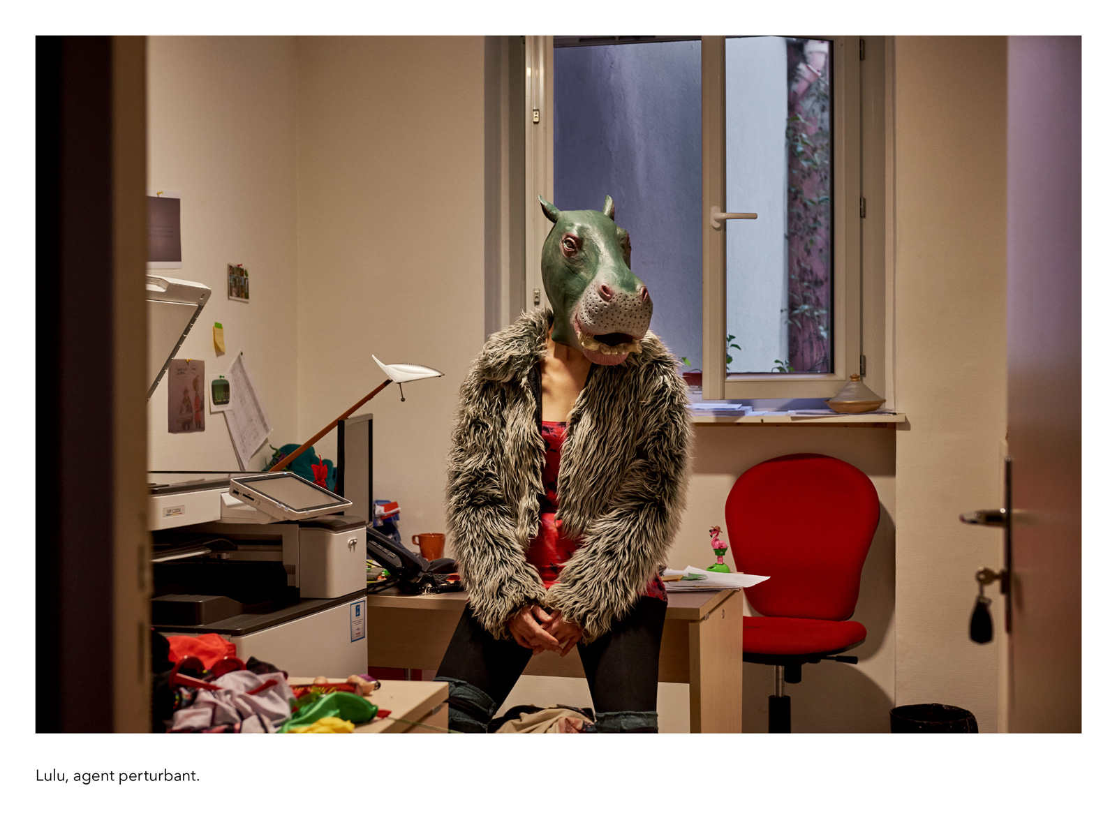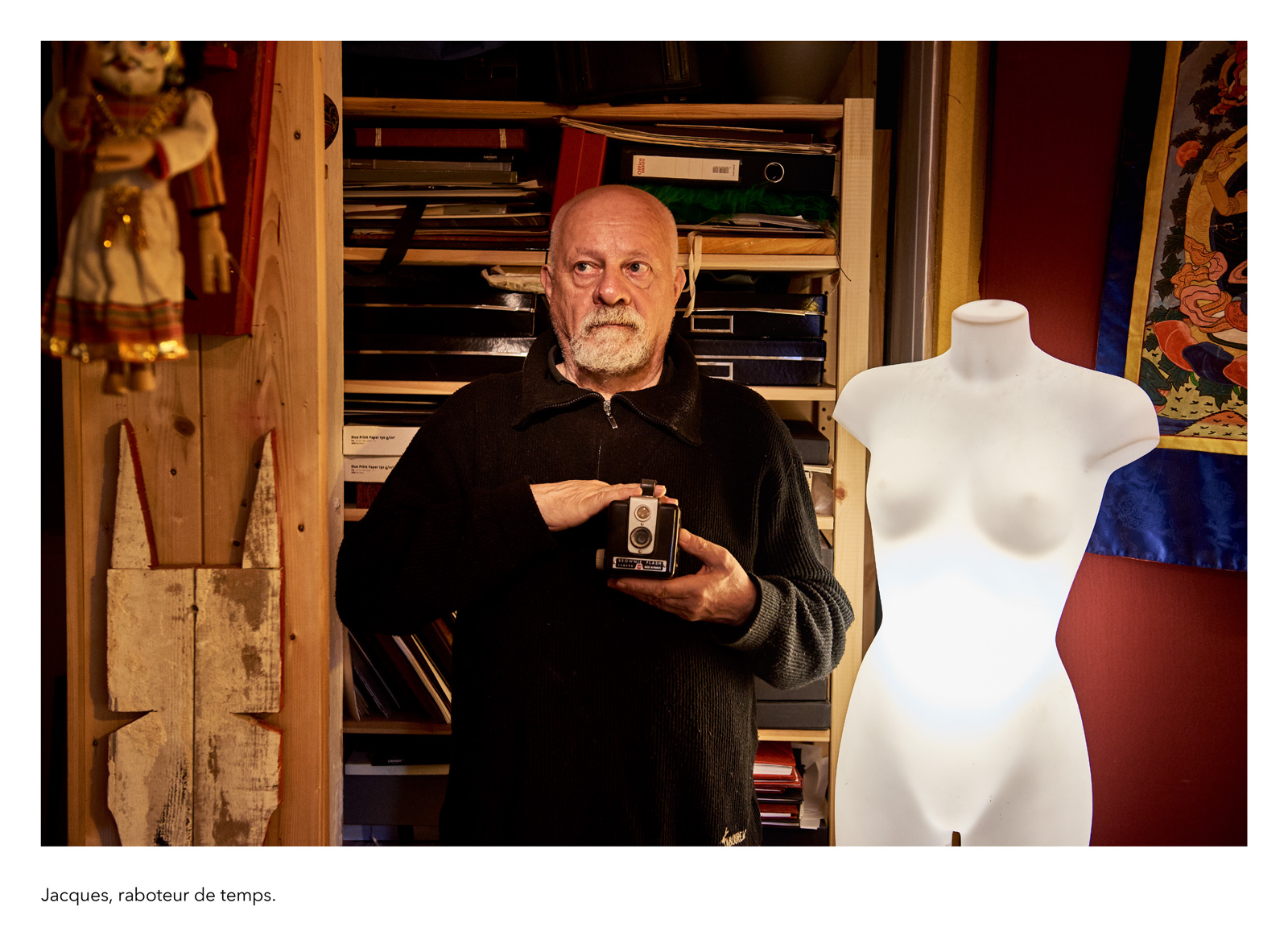 Dans la tradition des clichés de travailleurs posant avec la solennité de leur fonction, je réalise une galerie de portraits d’anonymes qui figurent des métiers imaginaires. Il se présentent à nous avec leur prénom véritable et la profession qu’ils se sont choisie, incarnation éphémère d’une vocation impossible ou allusion grinçante au monde du labeur réel. La scène est sobre et plausible : rien de plus qu’un geste, un outil improbable, une façon d’être, un milieu naturel…