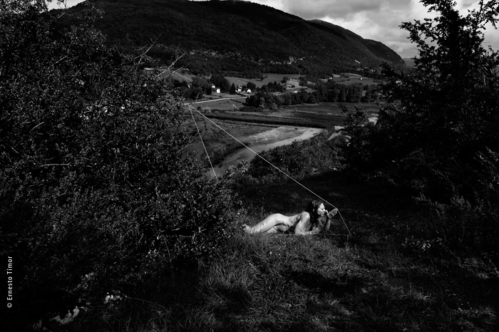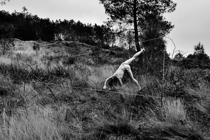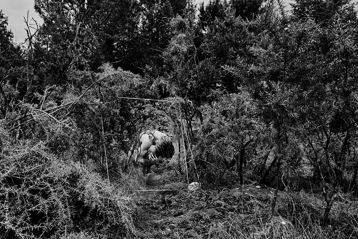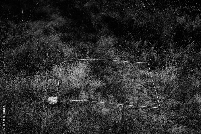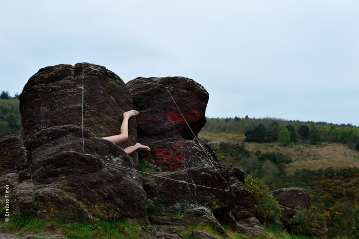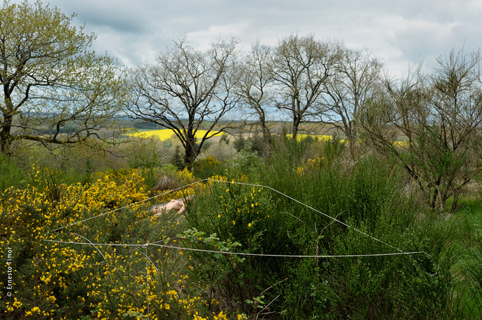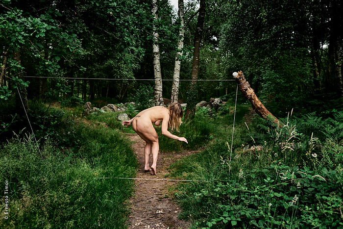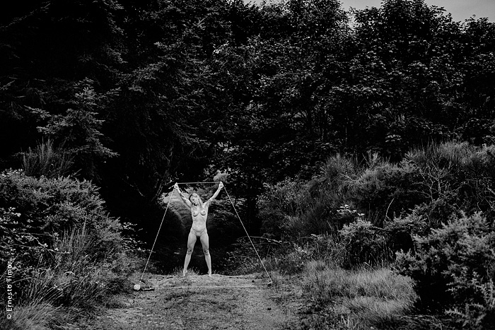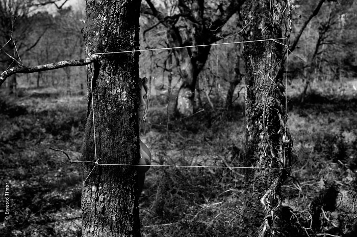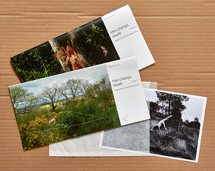 La balade est irrégulière, elle s’interrompt chaque fois que le paysage dicte une station. Une configuration indéfinissable, un arrangement du décor, une coïncidence de lumière… bel endroit pour une apparition ! Mes champs visuels est un projet que j’ai d’abord mené au cours de deux petites immersions en paysages naturels. Le cycle 1 a été photographié en forêt de Brocéliande au printemps 2014, le cycle 2 à l’été 2014 dans le Bugey, avec compléments à Lyon. Un troisième et dernier cycle est en cours, il se peut qu’il boucle la boucle en forêt de Brocéliande. Tous les cycles d’apparitions et disparitions se sont faits avec la complicité d’Angèle Bangor. Indiscrétions sur le cycle 3 (en cours, parution à venir). Produits dérivés. Ce projet a engendré une filiation qui ne tient pas en place, intitulée Pour que tu ne perdes pas le fil. On y retrouve la pelote de cordeau, qui cadre un peu tout ça. Cette contrainte créative mise à part, l’approche est différente, voire complémentaire : l’humain est au premier plan, c’est lui qui décide comment tout cela va se dérouler, en l’impliquant à des degrés divers. Ce basculement du côté de l’incertain et du déroulement intime a fait aussi changer le mode de restitution : c’est le chemin qui importe, ses tentatives et ses retours sur soi, il faut pouvoir glisser le long de cette profusion d’images intermédiaires, et la restitution passe donc des petits films photographiques, autant que de rencontres, de performances… A découvrir plus en détail ici…