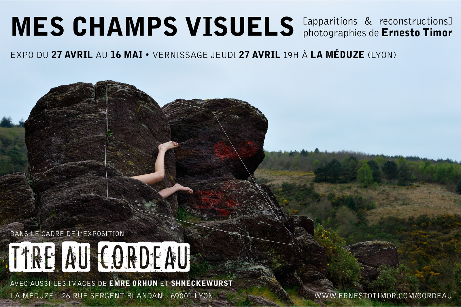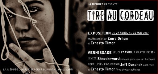Chaque cycle a fait l’objet d’une publication en tirage limité (50 ex.) dans la collection Surfaces sensibles des éditions Image Latente. Eh oui, de vrais livres — grands en format sinon en nombre de pages, plutôt étonnants, un peu beaux, en somme ! Tous les détails et le moyen de commander sur le site des éditions Image Latente… Expo à l’affiche : du 27 avril au 16 mai 2017, à La Méduze (Lyon 1er). Sous le titre Tiré au cordeau, 8 grands tirages de Mes champs visuels, face aux photographies d’Emre Orhun qui fait parler les cordes à sa manière… Vernissage le jeudi 27 avril avec le guitariste Jeff Duschek qui performe en live sur la projection de l’intégrale à ce jour des courts films photographiques de Pour que tu ne perdes pas le fil, nouvelle étape de ce projet !