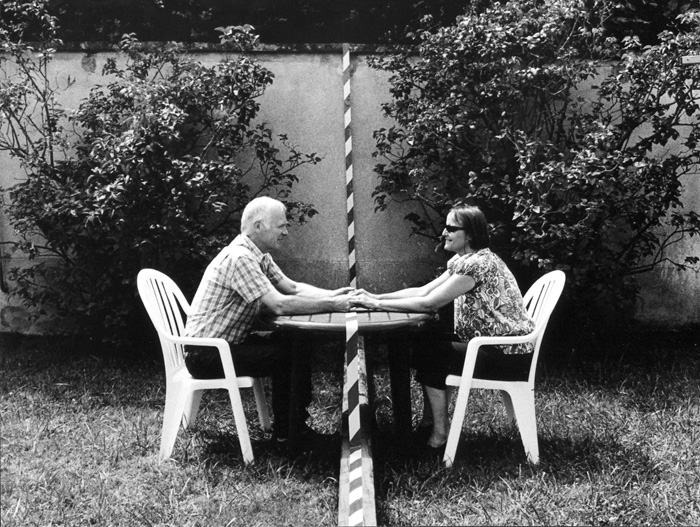 Le gros de l’exposition Les limites nous regardent est fait d’une vingtaine de « Panoptiques naturels », grands tirages de proportions panoramiques. D’autres petites formes sont aussi présentées, mosaïques sérielles qui parlent moins de contemplations frontalières, davantage des liens qui sillonnent nos espaces mentaux : dans chacun de ces « Parcours en marge », une personne joue sur le fil à sa manière… L’expo occupe deux salles et comporte en complément de programme une projection des vidéos « Face A » et « Face B » ainsi qu’une « Zone à part » dans un mur de vitrines.