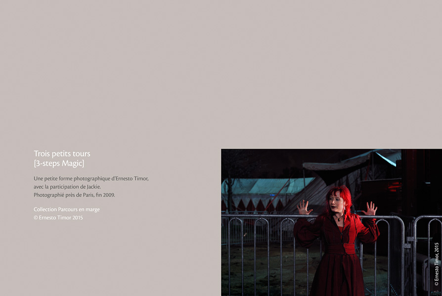 Trois petits tours [3-Steps Magic] est une séquence en grande partie inédite, même si les photos datent de fin 2009. L’une d’elle est une image phare des Limites nous regardent, au point qu’elle a un peu écrasé ses collègues ; mais à la réflexion, la publication d’une véritable séquence s’impose, composée de trois mouvements, comme toute bonne magie… Mercis renouvelés à l’écarlate Jackie (aux costumes et à la performance dansée).