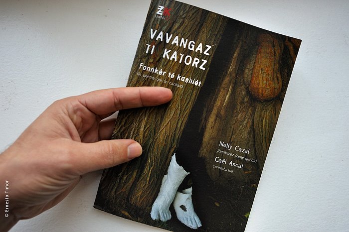 En main le livret édité à l’occasion du spectacle Vavangaz Ti Katorz*, avec des extraits bilingues (kreol/français) du texte et Vavangaz photographique cosigné Ernesto Timor (à la photo et au graphisme) et Nelly Cazal (emplâtreuse et fonnkézèz [celle-qui-dit])…